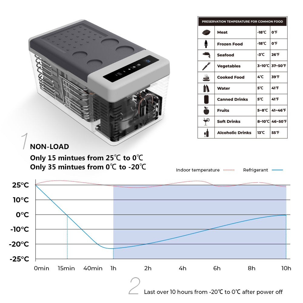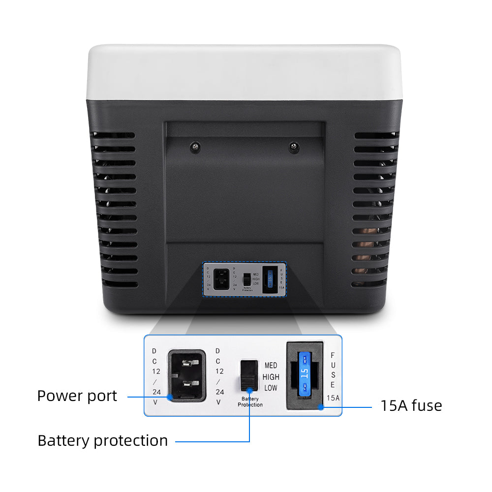 - Battery Protection: When the input voltage reaches the minimum limit, the system will automatically cut off the compressor to protect the battery from excessive comsumption.